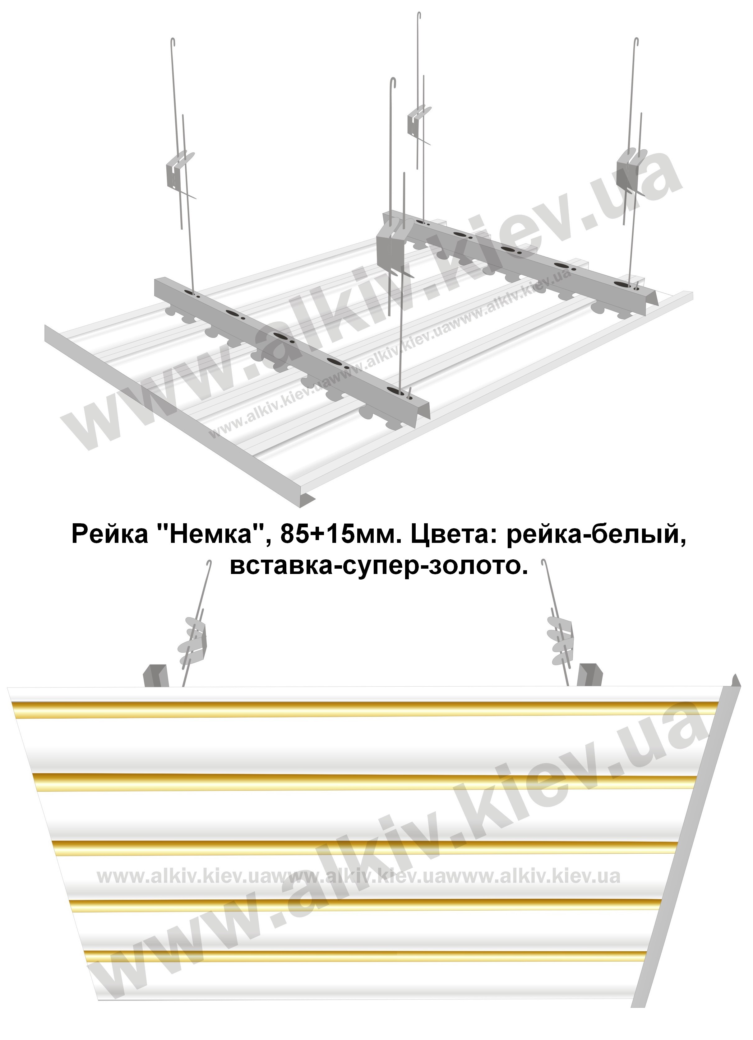 Реечный потолок БЕЛЫЙ 85мм, вставка СУПЕР-ЗОЛОТО 15мм АЛЮМ Киев