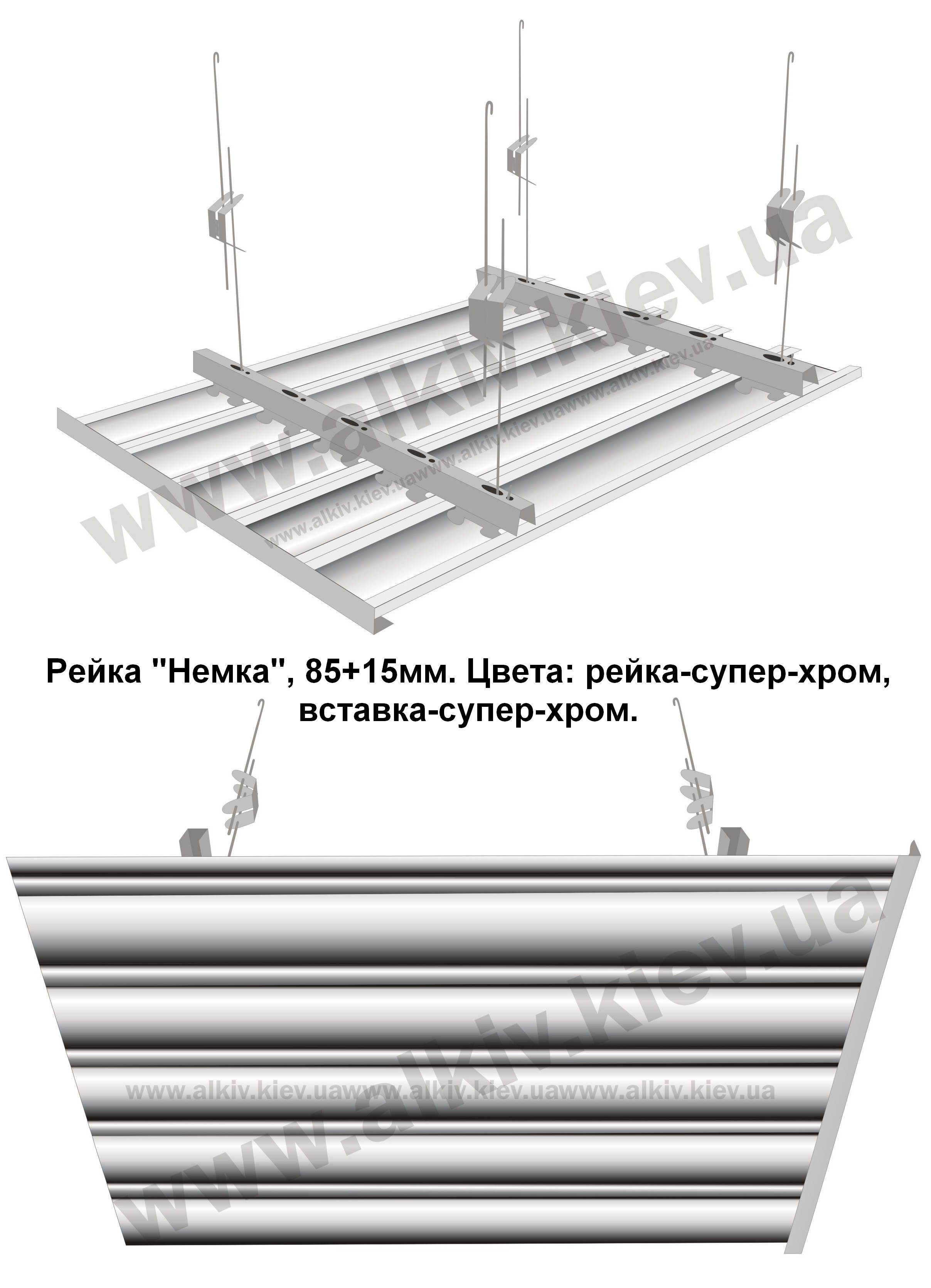 Реечный потолок СУПЕР-ХРОМ 85мм, вставка СУПЕР-ХРОМ 15мм АЛЮМ Киев